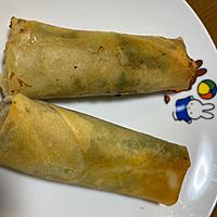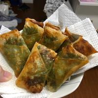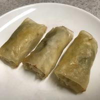 三人家族なので、もやし一袋200g、にんじんと干し椎茸を少しずつ足して、9本、残りは魚肉ソーセージを巻いて、作りました。サバの水煮缶にしっかり味がついているので、もやしは塩胡椒で丁度良いですね。ひっくり返すのが早かったのか、皮が破けてしまったものもありましたが、少ない油でもカリッとあがり、美味しかったです