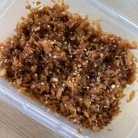 - 2 フライパンにサラダ油をひき、1を入れ弱火で熱し、新生姜の香りが立ってきたら中火にし、かつお節、白いりごま、(A)を入れ全体に味をなじませます。