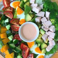 手作りドレッシングがクリーミーで爽やかな味わいが大好評!ヨーグルトのまろやかさとニンニクの風味が絶妙です。サラダチキンやアボカド、トマト、ゆで卵などゴロゴロとした具材が食べ応え抜群。チリパウダーやクミンを加えてアレンジも楽しめます。切って盛り付けるだけの簡単調理で、彩り豊かな一皿に。お店のような本格的な味わいで、野菜がモリモリ食べられると好評です。