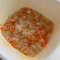 - 5 別の耐熱ボウルに1と離乳食用野菜スープを入れ、ふんわりとラップをかけ、500Wの電子レンジで1分程加熱します。一度混ぜ合わせ、再度ふんわりとラップをかけ、500Wの電子レンジで1分程加熱し、そのまま5分程蒸らします。