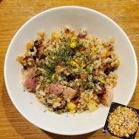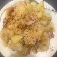 米1.5合+玄米0.5合、ジャガイモ1個、玉ねぎ1/2個、人参1/2本、ブロックベーコン、冷凍コーン&グリンピース適量、ニンニク2片、コンソメ3個(粉砕にして)、水280ml+白ワイン120mlで、仕上げにバター10g。少し薄味に感じたので、よそった後で追いバター一人5g。しっとりしてバターの風味が美味しかったです。お米が少し固めだったので、次は水分少し多くして弱火20分+蒸らしにしようと思います。