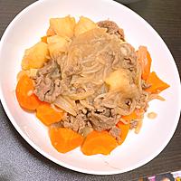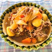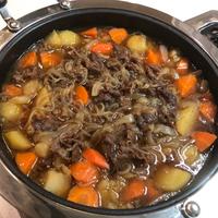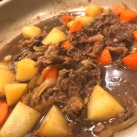 贅沢だけど牛こま300グラム使いました。ジャガイモにすっと爪楊枝が通るまで煮ました。10分くらいです。