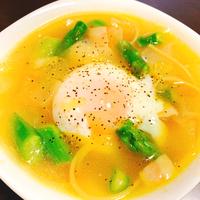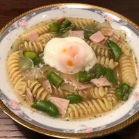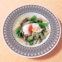 春らしい緑のミネストローネはいかがですか?ミネストローネというとトマト味を思い浮かべますが、春野菜をたっぷり入れて鮮やかな緑のミネストローネに仕上げました。温泉卵のとろりとした黄身がCarboffフジッリにからんでとても美味しいですよ。この春に是非お試しくださいね。