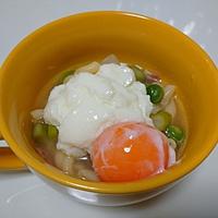 - 5 器に盛り付け、温泉卵をのせます。粉チーズ、黒こしょうをまぶして完成です。