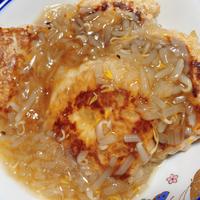 - 5 4のフライパンに残っている油をキッチンペーパーで取り、1でソース用に取り分けておいたもやしを軽く炒めて(B)を加えます。途中味見をし、必要な方は塩を適量加えてください。沸騰したら火を止めずに水溶き片栗粉を加えて全体をよく混ぜます。とろみがつけばソースの完成です。