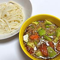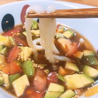フレッシュなトマトとアボカドが入った洋風のつゆにつけて、つるっとさっぱりいただける冷やしうどんです。つけつゆをアレンジすることで、いつものうどんとはまた違うおいしさが味わえますよ。ぜひお試しくださいね。