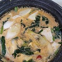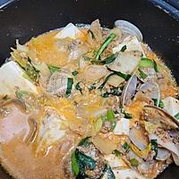 2倍量で作りました。レシピ以外に白菜やシメジ、しいたけとアサリの変わりにシーフードミックスで♫最後に落とし卵をして、魚介の味と合挽き肉の味と豆乳味が混ざってすごく美味しかったです!また、絶対リピします(∗ˊᵕ`∗)