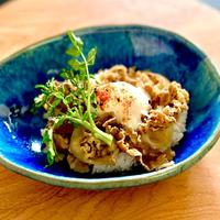 この一杯だけで満腹になれる満足な一品です。すきやき風のたれに味付けした具材に溶き卵をかけて半熟状態であげることでとろとろな食感が味わえます。お好みで七味唐辛子や温泉卵などをのせてお召し上がりください。