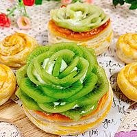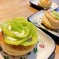 冷たくてさっぱりとしたキウイの爽やかさと、蜂蜜で甘みを加えたクリームチーズの濃厚な味わいが絶妙にマッチします。市販のパイ生地を使うので初心者でも簡単に作れ、見た目も華やかな仕上がりに。薔薇型に並べると豪華なデザートに大変身!キウイの代わりにいちごやりんごなどお好みのフルーツでアレンジも可能です。カスタードクリームを使うバリエーションも好評です。