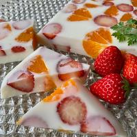 みかんといちごの断面が可愛い牛乳寒天です。定番のみかんの牛乳寒天には、みかんの缶詰を使用することが多いですが、今回は生のみかんを使用しました。キウイ、パイナップルなどを一緒にいれても、かわいい断面の寒天になります。是非お試しください。