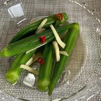 オクラ12、生姜(ひょうたん形1/2)、鷹の爪輪切り小さじ1/2、白だしそのまま大さじ3
