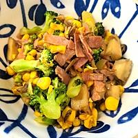 - 5 焼き色がついたら、3とコーンを中火で1分ほど炒め、弱火にして(A)を入れ、全体に味が馴染むよう炒め火から下ろします。