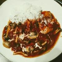 - 4 しめじを加えて更に2分煮ます。 ごはんと共に器に盛り付け、お好みで生クリームをかけ、みじん切りにしたパセリを振り完全です。