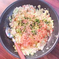 - 1 キャベツは1cm角に切ります。青ねぎは5mm幅に切ります。紅生姜は粗みじん切りにします。