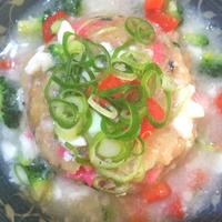 - 2 塩こしょう、鶏がらスープの素、みじん切りにした長ネギとハム、ごま油を入れてよく混ぜ合わせたらふんわりラップをして600wで2分半レンジにかけます。