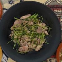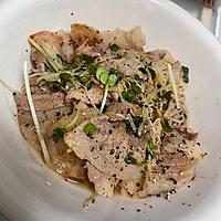 厚切りの豚バラ肉、2回目の豆苗、もやしプラスで。野菜が多かったからか味が薄くなったので塩胡椒をかけていただきました、塩レモン味で美味しかったです🙆♀️