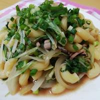 - 5 弱火にして塩辛とソースを軽く混ぜて、玉ねぎ、水菜とマカロニを和えます。 野菜が少ししんなりとしたらお皿に盛り付けます。
