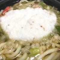 卵なし、長ネギとカニカマ、天かすで。とろろがあると豪華でいいですね!