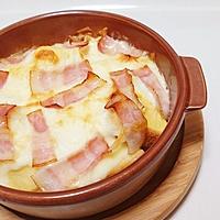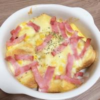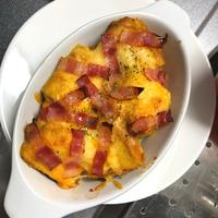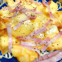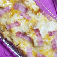 - 4 耐熱皿に3を入れ、ピザ用チーズと2の順に散らしトースターで10分、チーズに焼き色がつくまで焼きます。