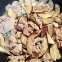 - 4 豚バラ肉に焼き色がつき火が通ってきたら、調味料を加え、味がなじんだら火から下ろします。