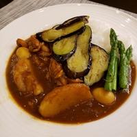 鶏肉は手羽元ともも肉使用。甘栗とうずら卵も投入。ナスとアスパラは、オリーブ油で炒めてトッピング。