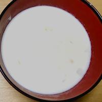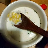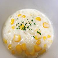 - 3 2に(A)を三回くらいに分けて入れ、コーン、塩、白こしょうを加えて2分程煮込み、器に盛りつけ、完成です。