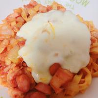 豆板醤を加えてピリ辛にしたナポリタンに溶かしたピザ用チーズをかけました。とろーりチーズがピリ辛ナポリタンによく合い、どんどん進んでしまいます。定番のナポリタンとは一味ちがう仕上がりです。ぜひ、お試しください。