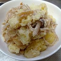 - 2 熱いうちにフォークで粗くつぶし、粗熱を取ります。市販の切り干し大根の煮物、マヨネーズを入れて全体がなじむまでよく混ぜ合わせます。