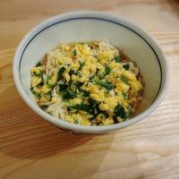 - 2 フライパンにごま油をひき、ニラを加えて中火で炒めます。ニラに軽く火が通ってきたら、溶いた卵を流しこみ、中火で軽く火を通した後に菜箸などで炒めます。