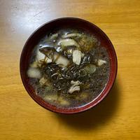 - 5 3の鍋に1、4、もずくを入れて中火にかけ、沸騰したら塩、薄口しょうゆを加えて全体に味がなじんだらごま油を加えて火から下ろします。