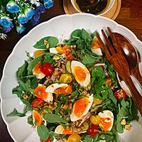ツナ、半熟たまご、紫玉ねぎ、くるみ、カボチャの種など。