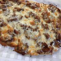 - 4 クッキングシートに1を3mm厚さに広げ、2を塗り、3とピザ用チーズをのせて天板にのせ、オーブンで10分焼きます。