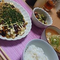 ブロッコリーがなく、緑代用として絹さや湯がいたものを、赤色代用に家でとれた皮が固いプチトマトを使いました。