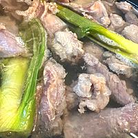 - 5 牛すじ肉がやわらかくなったら長ねぎと生姜を取り出し、ザルに上げます。粗熱がとれたら一口大に切ります。