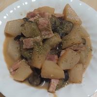 - 2 大根は厚めに皮をむいて乱切りに、薄切りハーフベーコンは一口大に切ります。