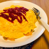 - 7 中火で熱したフライパンにサラダ油を引き、6を流し入れて半熟に焼けてきたら5に乗せてケチャップをかけたら完成です。