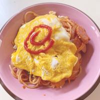 ナポリタンスパゲティに、とろっと半熟で美味しい卵を乗せた一品です。 ケチャップを使用したナポリタンはみんな大好きな味付けになっているので、とても喜ばれますよ。 簡単に出来ますので、ぜひお試しくださいね。