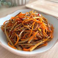 はちみつを加えた甘辛い味付けが特徴的で、ごま油の香ばしさと鷹の爪のピリッとした辛みが食欲をそそります。ご飯がすすむ美味しさで、お弁当のおかずや常備菜としても大活躍。材料はごぼうと人参がメインで、ピーラーで削れば簡単に調理できます。お好みでしいたけやひら天を加えてアレンジも楽しめます。作り置きできて日持ちも良く、お酒のおつまみとしても最適です。