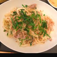 水菜と大葉のさっぱり焼きうどん。和風顆粒だしと酒、塩昆布、人参椎茸入れて、お醤油で味付け。