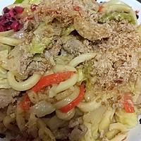 - 6 豚こま切れ肉に火が通ったら、中火のまま1を入れてさっと炒め、うどんと(A)を入れてさらに炒めます。