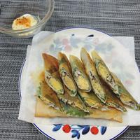 - 3 春巻きの皮に2を2枚ずつとししゃもを乗せて包み、閉じ目に水溶き薄力粉を塗って閉じます。