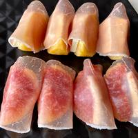 アマレットの風味が香る柿とイチヂクを塩気のある生ハムで巻いたフルーティな前菜のご紹介です。そのまま食べても美味しい果物ですが、ちょっとアレンジをきかせると立派な一品になります。口の中でアマレットの香りがふわっと広がり、白ワインともよく合います。ぜひお試しください!