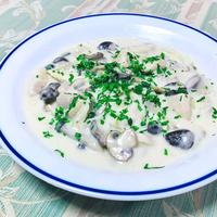 ホワイト&ブラウンマッシュルーム・ひらたけ・エリンギ・しめじ使用、ローリエ追加、サワークリーム多め、鶏肉(ブライニング済み)は塩胡椒してオールスパイスパウダーも塗してます。隠し味でウスターソース少々。