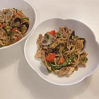 - 7 アサリの口が開いたら、1、2、春雨を入れて混ぜ合わせ、水分を飛ばしながら中火で5分程加熱します。豚バラ肉に火が通ったら残りのごま油を入れて混ぜ合わせ、火から下ろします。