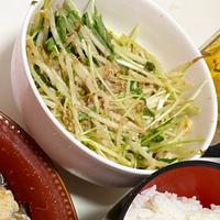 水菜ともやしを使用した和え物のご紹介です。シャキシャキした水菜ともやしの食感がおいしいですよ。火を使わず、電子レンジだけでとても簡単に作れます。今夜のおかずにいかがでしょうか。ぜひ試してみてくださいね。
