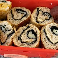 - 4 2の全体に3をのせ、その上にのりをおき、プロセスチーズをのせます。手前から巻いていき、巻き終わりをつまようじで2ヶ所ほど止めます。同様にもう1個作ります。