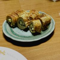 - 5 フライパンにごま油をひきます。4の巻き終わりを下にして乗せ、蓋をします。中火で加熱し、全体にこんがりと焼き色がつき、中まで火が通ったら取り出します。つまようじを取り、食べやすい大きさに切り分けます。