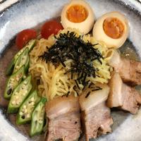 煮卵、トマト、オクラ、自家製チャーシュー、刻み海苔使用。