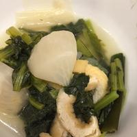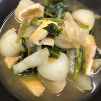 油揚げは味が染みて美味しかったです。ネギもトロトロで👍カブの葉が無く、ほうれん草が余ってたので、加えました。色合いが良くなって加えて良かった✨
