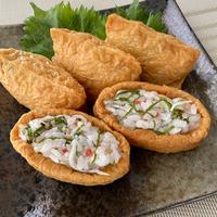 - 3 6等分にして、お稲荷さんの皮に詰めます。同様に5個作り、お皿に盛り付けてできあがりです。